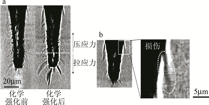 超快激光由于作用時間非常短,加工時的熱滲透很小,在玻璃樣品上不會留下很大的熱影響區域,能夠有效地減少加工后微裂紋的產生。ARGUMENT使用波長為248nm~800nm、脈寬為130fs~300fs的飛秒激光器在石英玻璃上加工出寬度在25μm~40μm,深度可達100μm的微孔,后續研究發現通過在加工前預熱玻璃基板,在玻璃基板上預先制備金屬鎢薄膜,加工后通過過氧化氫腐蝕去除的辦法可以有效地減少裂紋和碎片的產生。CHUANG等人利用波長為1065nm的皮秒激光器在超薄玻璃上加工出一連串直徑為3μm、間隔為2μm~3μm的通孔,在掃描電子顯微鏡(scanning electron microscope,SEM)下觀察玻璃微孔橫截面發現沒有可見的熔化區,這表明皮秒激光加工微孔時的熱影響區基本可以忽略不計。ITO等人對化學強化玻璃進行飛秒激光打孔試驗, 并通過數值分析加工時的應力波的傳播及溫度場的分布,發現制孔側壁和底部的殘余應力主要是由應力波引起的,而孔入口周圍的損傷則與熱應力的弛豫有關,如圖 6所示。WEI等人建立了基于飛秒激光抽運-探測原理的時間分辨陰影成像平臺,直接獲取了飛秒激光燒蝕石英微孔的超快過程圖像,如圖 7所示。通過對不同能量密度、時間延遲、脈沖條件下拍攝圖像的分析,發現在飛秒激光燒蝕制備石英微孔的過程中,當能量密度低于石英玻璃破壞閾值時,石英玻璃表面觀測到沖