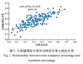在推算年總太陽輻照量時,多是以季節(jié)( 月) 的實測太陽輻照量數(shù)據(jù)與日照百分率等常規(guī)氣象數(shù)據(jù)來擬合得到經(jīng)驗系數(shù),從而計算得到理論年總太陽輻照量。